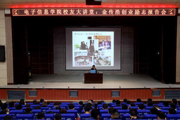 现如今他们已在创业路上事业有成。但是学子们无法忘记母校带给他们的温馨情感,为了追忆当年那些青涩的大学时光,4月14日,他们中的优秀代表回来了。学校副校长能发涯,工会主席、宣传部长郑柏松分别接见了金传浩等优秀校友,并向他们介绍学校十几年来的发展变化,鼓励他们为学校发展献计献策,共谋beat365官网发展大计。同时,为了让在校学生感受校友卓越成就,学习创业成功之道,懂得如何规划人生,特意邀请校友代表、浙江光硕光伏科技有限公司董事长金传浩为2016级、2017级学生作创业励志报告。金传浩追忆了大学三年的精彩青春、讲述了创业历程感悟。他感叹,“18年前我从黄职开始了我的人生追梦之路,从担任学生干部带学生团队,到现在事业上取得一定成绩,正是得益于母校的培养和老师们的谆谆教诲,自己永远爱着母校,黄职是我永远的家园”。