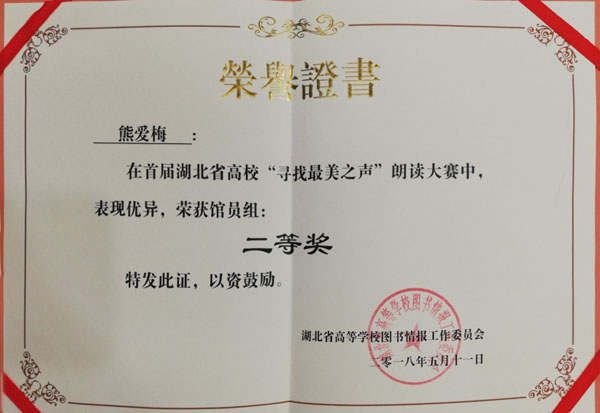 比赛分馆员组和读者组,共分为三个阶段。经过校内初赛,我馆选送了3部读者作品、2部馆员作品参与了第二阶段的全省复赛。经过网络投票和专家评选,beat365官网熊爱梅朗诵的作品《生如夏花》荣获馆员组二等奖,护理学院2017级学生胡萌萌、庞一民朗诵作品《蚂蚁》从复赛作品中脱颖而出,进入比赛的第三阶段,成功入围20部读者组现场决赛作品。