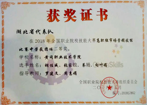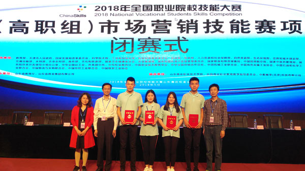 2018年5月19日-5月20日,全国职业院校技能大赛高职组市场营销技能赛项在山东济南举行。来自全国32个省市84所高职院校的代表队,经过2天紧张激烈的角逐,共有8所高职院校获一等奖,17所院校获二等奖,25所院校获三等奖,beat365官网商学院由胡佳威、张家啟、蔡嫚、向叶娟组成的营销团队在罗建文、周惠娟两位老师的指导下,荣获团体二等奖,是湖北省今年本赛项最好成绩。