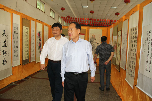 黄冈市文明办主任曹成发(右)、校党委书记张新佳(左)参观作品展