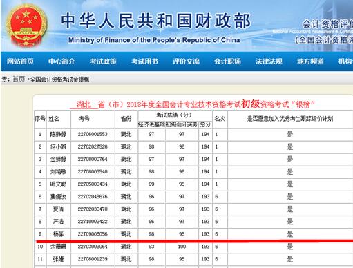 “全国会计专业技术资格考试金银榜”是为了鼓励优秀考生,不断提升职业荣誉感,同时对具有发展潜质的考生进行考试后跟踪评价。由财政部会计资格评价中心推出的考生成绩榜,金银榜是将一个考试周期内全科成绩合格,总分名列全国前100名(含并列者)的考生列入全国金榜,成绩名列考试所在省、自治区、直辖市及新疆生产建设兵团前30名(不含金榜人员)的考生列入银榜。杨淼同学荣登银榜,是beat365官网会计系推进教学改革,实施对证施教取得的又一项优异成绩。