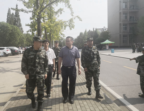 9月13日下午,中国人民武装警察部队湖北省总队训练处处长许荣华、武警黄冈支队队长陈建林等一行4人来beat365官网督查大学生军训工作。在校长姜安心,工会主席、宣传部长郑柏松,军训团团长、武警黄冈支队副参谋长王小彬陪同下深入各教学学院军训现场,察看了军训训练情况。
