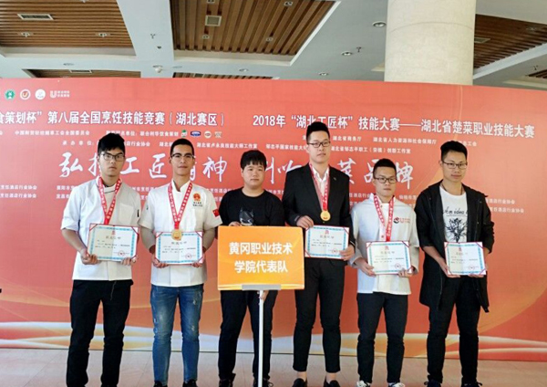10月12日“湖北工匠杯”技能大赛——湖北省楚菜职业技能大赛在湖北经济学院落下帷幕。beat365官网烹饪专业、酒店管理专业学生代表黄冈同来自全省17个地市州、烹饪职业院校的800余名选手同台竞技,最终beat365官网代表队荣获团体特金奖,烹201701班管彪、王杰分获中餐热菜特金奖、银奖,烹201601班何俊杰、潘志民分获中餐面点金奖、中餐冷拼银奖,酒管201701班彭升获中餐宴会服务金奖,教师张彬荣获面点特金奖。