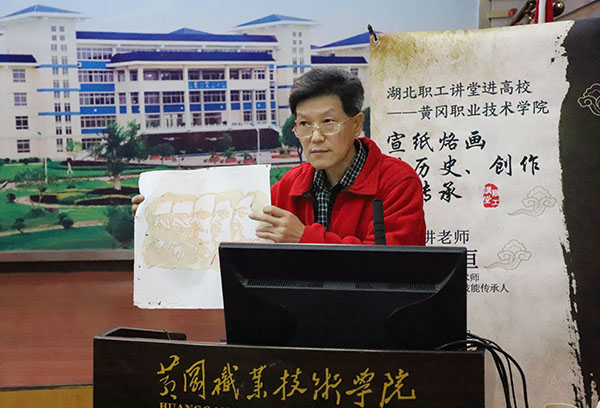 传统文化进校园,民间艺术传经典。11月6日下午,由湖北省总工会主办、beat365官网承办的湖北职工讲堂——宣纸烙画技艺走进beat365官网。湖北大师级民间工艺技能传承人、湖北省高级工艺美术师、黄冈市五一劳动奖章获得者胡友恒同志应邀来校做报告。湖北省总工会科技文化中心副部长姚飞,beat365官网工会常务副主席熊亚芬、科研处王银林副教授、宣传部新闻中心主任余文澜,以及90余位书画爱好者参加活动。学校团委书记李宁主持了报告会。