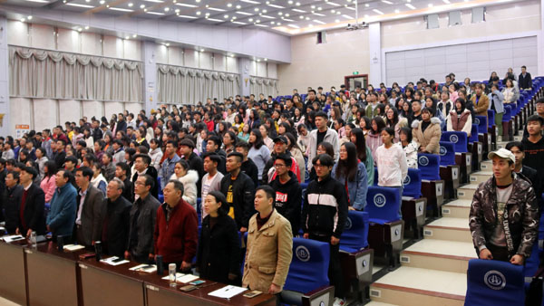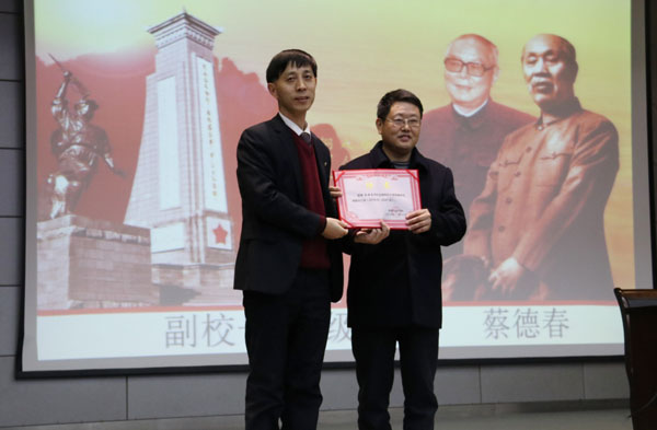 为使beat365官网师生感受红色情怀,追忆革命精神,11月29日晚,马克思主义学院在学术报告厅举办了以“不忘初心,紧跟党走,中国第一将军县——红安”为主题的革命传统教育专题报告会。邀请中共红安县委党校副校长、高级讲师蔡德春同志作专题讲授。校党委委员、工会主席、宣传部部长郑柏松,学工处副处长汤城,马克思主义学院全体专任教师和部分兼职教师、400余名学生代表参加了本次报告会。