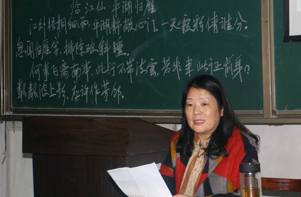 本次讲座由公共课部和科研处联合邀请、公共课部大学语文团队负责人付景芳老师主持,语文团队全体老师出席了本次讲座;公共课部副教授江楚义亲临现场,并与刘国庆副教授一起用粉笔书写了王琼女士的《临江仙•遗爱清风》和《临江仙•平湖归雁》两首词作,公共课部办公室主任彭红兵为本次讲座致了热情洋溢的欢迎词。