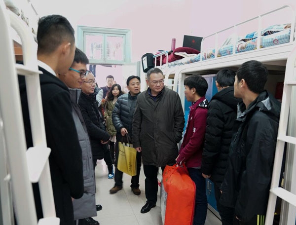 学校领导们先后到东区、南区、西苑和北区的多栋学生宿舍,为家庭经济困难学生送去了厚实的保暖衣和棉被,把温暖送到贫困学生手中。也鼓励他们坚定信念,刻苦学习,牢记使命,知恩感恩,用自己的实际行动感恩学校、感恩社会、感恩国家。