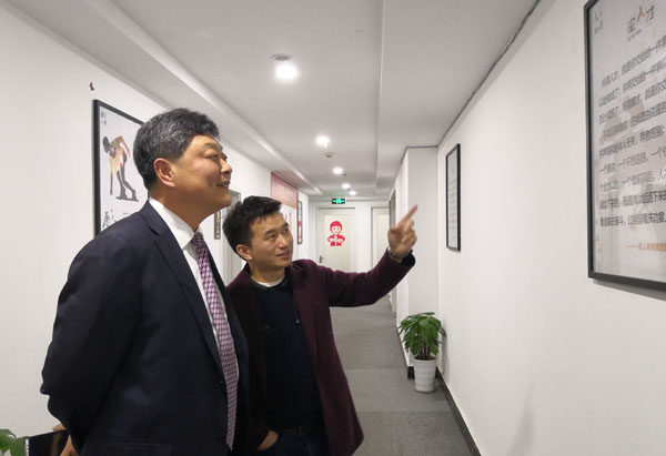 调研期间,张新佳一行还参观了电子信息学院2004届校友肖本浩创办的重庆毛毛虫电子商务有限公司。目前该公司有300余名员工,2018年产值预计可达26亿元。优秀校友肖本浩向张新佳书记汇报了毕业后的打拼经历,并就大学生综合能力培养、企业文化塑造、电子商务产业发展等方面进行了坦诚交流。