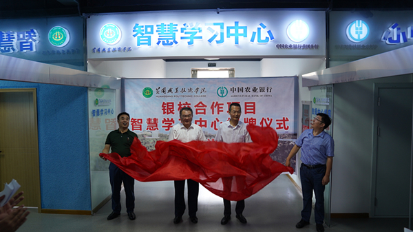 焦胜方、江中鸿、姜安心、刘东山共同为“银校合作项目智慧学习中心”揭牌。仪式后,焦胜方一行参观了建成的智慧学习中心。