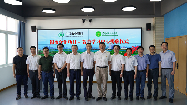 2019年6月6日上午,学校银校合作项目智慧学习中心揭牌仪式在学校智慧学习中心举行。中国农业银行黄冈分行党委书记、行长焦胜方、个人金融业务部总经理冯正子、营业部总经理罗志华、营业部副总经理夏鲲鹏、开发区支行行长周锐,湖北光影空间系统工程有限公司董事长江中鸿,学校党委书记张新佳、校长姜安心、副校长熊发涯、刘东山及部分职能处室负责人出席揭牌仪式。揭牌仪式由熊发涯主持。