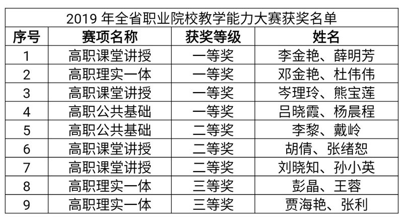 6月25日至28日,由省教育厅主办的湖北省职业院校教师教学能力大赛在武汉第一商业学校举行。此次大赛共设公共基础课程、课堂讲授型课程和理实一体型课程3个项目,来自全省460个教学团队920名教师参赛,beat365官网有9个教学团队,18名教师参加了此次大赛。7月19日,《省教育厅关于公布2019年全省职业院校教学能力大赛获奖名单的通知》文件公布,beat365官网获得了 4个一等奖,3个二等奖,2个三等奖的好成绩,获奖率100%,在全省名列前茅。