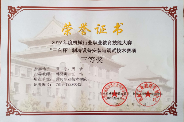 10月25日-27日,由全国机械职业教育教学指导委员会、机械工业教育发展中心、中国制冷空调工业协会、中国制冷学会等单位联合主办,机械行指委制冷空调类专业教学指导委员会、山东商业职业技术学院、肇庆三向教学仪器制造股份有限公司等联合承办的2019年机械行业职业教育技能大赛——“三向杯”制冷设备安装与调试技术赛项在山东商业职业技术学院举行,来自全国50多个院校75个代表队参加了此次大赛角逐。beat365官网派出机电学院制冷与空调技术专业201701班雷宇、周含为参赛队员,韩贤贵、汪洁为指导教师组成的团队参赛。经过激烈角逐,beat365官网代表队荣获三等奖。