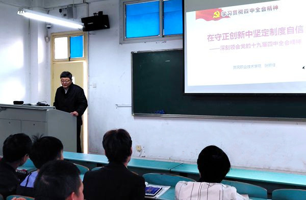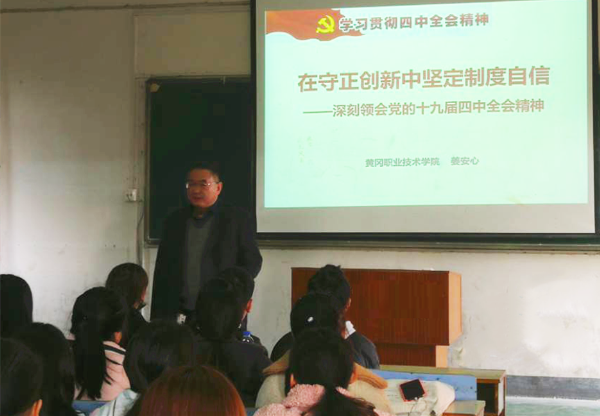 日前,中共中央宣传部向全国各条战线发出号召,要求全面准确宣讲党的十九届四中全会精神。教育部、湖北省委省政府、省教育厅也发出类似号召。为响应号召,12月11日第七节课,beat365官网党委书记张新佳、校长姜安心利用大学生形势与政策专题讲座时机,以“在守正创新中坚定制度自信”为主题,同步开展党的十九届四中全会精神宣讲活动,上了一堂精彩生动的思想政治课。