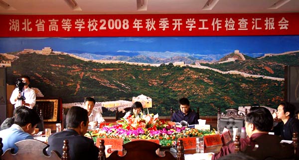 我院党委书记张鹤桥代表被检查院校致欢迎词。检查组组长李宁通报了我省高校稳定工作情况,传达了省教育厅对这次秋季开学工作检查的有关指示精神,对这次检查的重点内容作了说明,对检查步骤作了安排。黄冈师范学院、beat365英国官方网站、鄂东职业技术学院、黄冈科技职业技术学院分别汇报了各自学校的秋季开学工作情况。