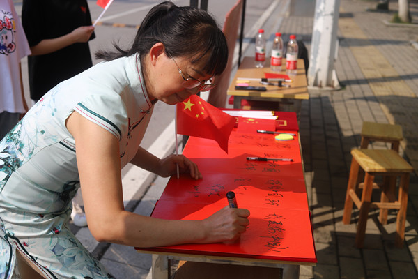 壮丽71载,喜迎盛世中国。青年马克思主义者协会精心制作宣传板,让参与学生了解国庆的由来,并通过签名与字帖留言的形式,祝福祖国母亲71岁生日快乐。军事爱好者协会通过军体拳、格斗、倒功的展示,开展国防教育、普及征兵知识,表达对祖国的热爱和励志保家卫国的决心。武术协会进行了刀、枪、剑、棍术和太极等传统武术的展示,健美操俱乐部展示了搏击操,以武传情,祝福祖国。汽车爱好者协会则开展了义务清洗国产车的活动,以志愿服务的形式表达对祖国的热爱之情。大学生艺术团组织了多个社团代表开展了“歌唱祖国”活动,同学们精神饱满,用嘹亮的歌声唱响了祝福祖国的昂扬旋律。