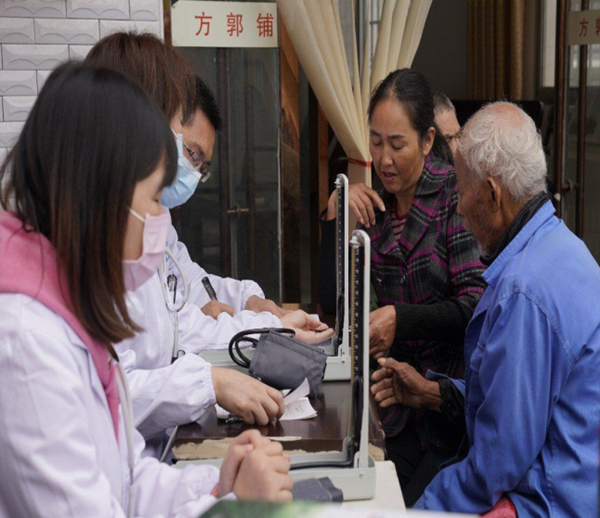 在村委大院,学校附属医院院长沈爱平带领3位医疗专家开展量血压、测心率、察病情、对症免费发放药品、宣讲保健知识的义诊宣传活动,现场为近百名村民进行了义诊。