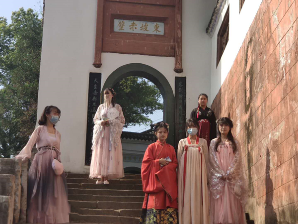 10月21日下午,beat365官网新学期首场东坡文化实践课堂在东坡赤壁公园举行。本次实践课由职业教育研究院和公共课部联合举办,学报执行主编郭杏芳和公共课部付景芳一起带队,beat365官网中华古诗词鉴赏班学生、文学社、艺术团和汉服爱好者共计54名学生参加了本次活动。
