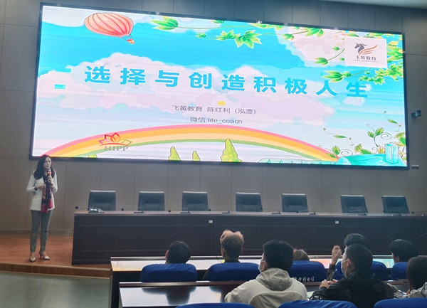 陈红利为飞黄教育董事长兼CEO,国际演讲平台TEDx《中国的阴阳哲学为世界幸福健康提供解决方案》演讲者,虎牙著名主播,知名积极心理学教练,行为分析和治疗顾问,易经咨询顾问,催眠治疗师,全球华人幸福健康发展中心联合创始人和首席顾问,喜马拉雅自媒体频道《HIPP积极心理学》创办人和主持人。本次讲座的主题为《选择和创造积极快乐人生》。陈红利从现场同学们的座位选择开讲,从积极心理学普及知识到积极心理的方法与运用,娓娓道来。助产、市场营销、旅游、网络等专业的学生积极参与互动,还有学生主动担任课堂小助教,现场气氛热烈。陈红利在讲座的尾声还特别开出了“幸福药剂”,她叮嘱每一位学生,从今天开始做一个积极快乐的人,开创美妙的大学生活。
