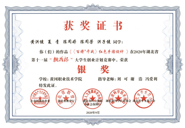 在2020年湖北省第十一届“挑战杯”大学生业创业计划大赛中,由学校电子信息学院和团委共同指导、培育的参赛项目《〈百将*千战〉红色手游设计》荣获银奖,这是学校将大学生思政教育、红色文化传承和学生竞赛深度融合,并将创新创业教育贯穿人才培养全过程取得的成果。