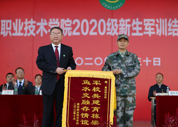 盛传发代表黄冈军分区作军训总结讲话。他代表部队全体官兵向在这次军训中取得优异成绩的连队表示热烈祝贺,感谢学校领导对部队工作的信任与支持。他也希望同学们在新的学期只争朝夕,努力学习,立志成才,为黄冈职院增光添彩。姜安心代表学校向黄冈军分区赠送锦旗,对军训团的辛勤付出表示感谢。