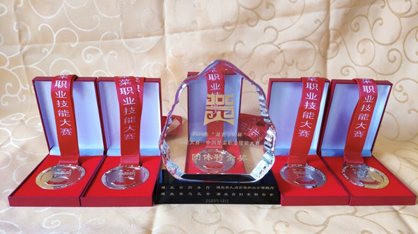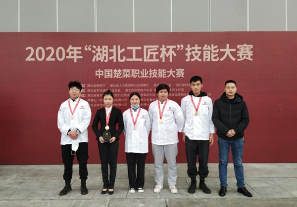 为叫响楚菜品牌、融合产业发展,2020年12月2日至3日,“湖北工匠杯”技能大赛——中国楚菜职业技能大赛在武汉国际博览中心落下帷幕。beat365英国官方网站(以下简称为“黄冈职院”)商学院烹调工艺与营养专业、酒店管理专业5名学生代表黄冈市同来自全省17个地市州的500余名选手同台竞技。最终,黄冈职院代表队荣获团体特金奖,酒店201901班夏沾获中餐宴会服务特金奖,烹饪201901班陈满、余毅、李一鸣分获中式面点、中式烹调、冷拼雕刻金奖各1项,烹饪202001班吴浩霖获中式烹调金奖。同时,黄冈职院张彬技能大师工作室制作的黄冈地标优品美食宴在楚菜博览会上展示。