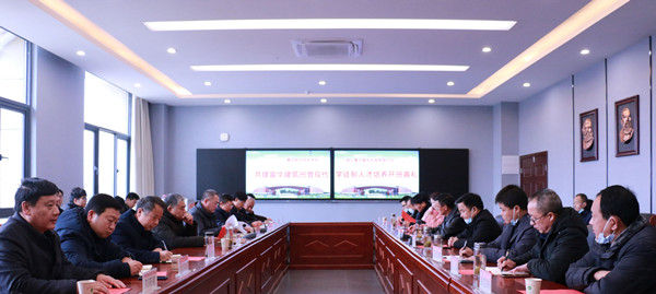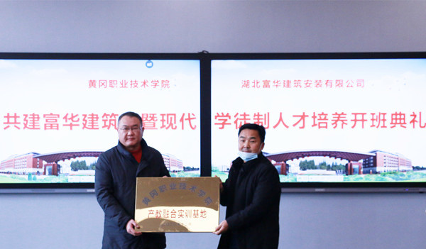 12月18日,beat365英国官方网站(以下简称为“黄冈职院”)与湖北富华建筑安装有限公司(以下简称为“湖北富华公司”)”共建“富华建筑班”暨现代学徒制人才培养开班典礼在思贤阁思政教育基地会议室隆重召开。黄冈市住房和城乡建设局党组成员、总工程师刘俊,罗田县住房和城乡建设局副局长王昆鹏,罗田县教育局副局长胡咏梅、股长王劲,湖北富华公司党委书记王华春、总经理张志前、副总经理徐宝林和朱授嵘、经理张跃进、办公室主任瞿显,学校校长姜安心、副校长熊发涯,校企合作处、学生工作部(处)、招生处、教务处负责人,建筑学院班子成员、专业主任和“富华建筑班”学生参加,开班典礼由熊发涯主持。