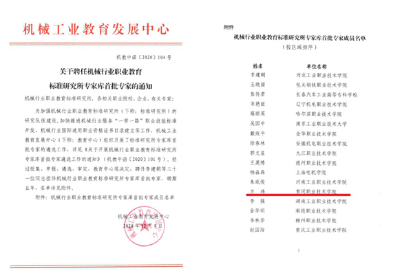为加强机械行业职业教育标准研究所的研究队伍建设,加快推进机械行业服务“一带一路”职业技能标准开发、机械行业国际通用职业资格证书目录建立等工作,机械工业教育发展中心组织开展了标准研究所专家库首批专家的遴选工作,经过征集、申报、遴选、审定,beat365官网机电学院院长方玮教授获聘机械行业职业教育标准研究所专家库首批专家成员,聘期五年。