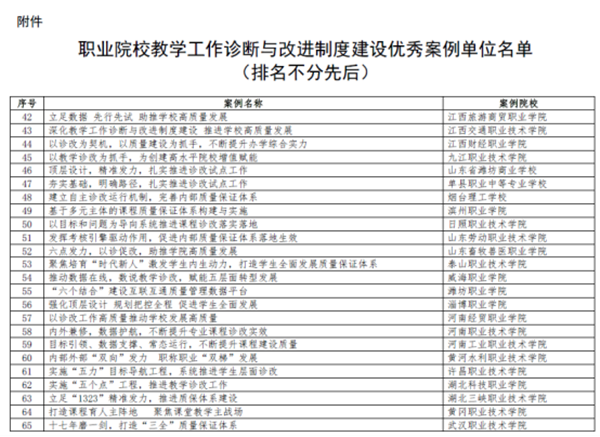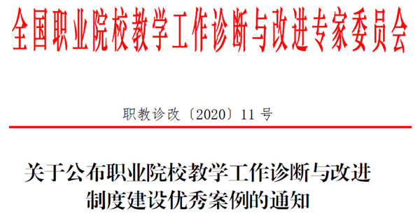 全国诊改专委会为全面总结诊改试点工作经验,加强对典型案例、理论研究成果的宣传推广工作,发挥试点院校的示范引领作用,2020年5月28日,发布了《关于征集职业院校教学工作诊断与改进制度建设典型案例的通知》。自通知发布以来,副校长熊发涯高度重视,积极组织质量管理处副处长万德年、诊改办公室副主任黄常翼认真准备相关材料,按期提交了案例。最终,beat365官网提供的案例从28个省份的475份案例中突围而出,成功入选职业院校教学工作诊断与改进制度建设优秀案例,全国仅有83所高职院校案例入选。