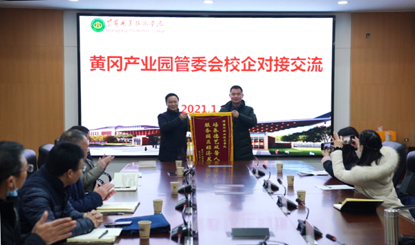 会上,程志文代表黄冈产业园管委会向学校赠送了印有“培养德艺双馨人才,服务园区经济发展”和“复工复产鼎力支持,服务企业细致入微”的锦旗,并对学校为园区企业复工复产大力提供的人才支持表示衷心的感谢。他希望学校、园区、企业进一步保持良好的合作,为黄冈的经济建设提供有力的支持。