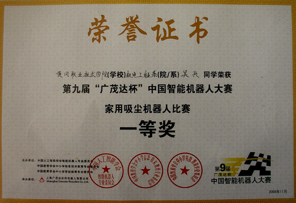 2008年11月13日—14日,第九届中国“广茂达杯”中国智能机器人大赛在上海宜川中学体育馆隆重举行。机电工程系由吴兵、张峥、廖谦、曾威四名同学组成的代表队,精益求精设计、积极主动创新,在全国164家参赛院校中脱颖而出,获得全国一等奖一项、三等奖一项的好成绩,位列全国高职院校首位,全国高校前列。金、铜牌和证书已发下来,特向全院师生报喜。
