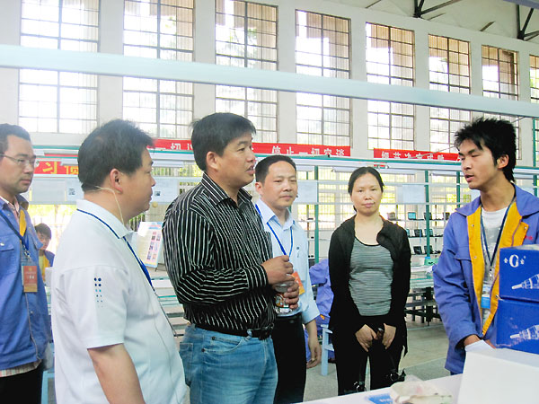 接着,林处长在张处长、张书记、熊教授的陪同下,来到深圳博宝科技有限公司(黄冈)冲压事业处,在机电工程系副主任倪祥明的引领下,详细地察看了每一个生产实训岗位,不时询问生产的产品的作用、设备的性能、设备价值和使用效率,在即将结束对该实训基地的考察时,遇上博宝科技有限公司董事长熊用兵。张书记将双方作了介绍后,林处长与熊董事长进行了深入交谈,林处长向熊董事长提了两个问题:“一是作为一个企业家和商人,你的目标是要获得利润,你把生产线放到黄冈职院得到了哪些好处?二是你如何保证产品质量?”熊董事长诚恳地告诉大家企业得到了五个好处:一是利用了学院的厂房和现有设备,减少了投资成本;二是利用实习学生生产产品,付给学生的报酬比企业的要低,减少了工资支出;三是利用学校的水电,水电价格比企业要低,减少了运行成本;四是利用学院的专业教师管理工厂,减少了管理成本;五是工厂的总部在深圳,湖北是我们重要的客户基地,从这里直接将产品运到湖北各地,减少了运输成本。在回答第二个问题时,熊董事长说,在保证产品质量方面,关键靠管理,这里的管理人员既有我们企业的技术人员,也有学院的专业教师,按照与总部完全一致的工艺标准和要求进行管理,事实证明,只要管理到位,产品质量完全有保证。