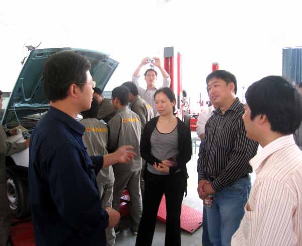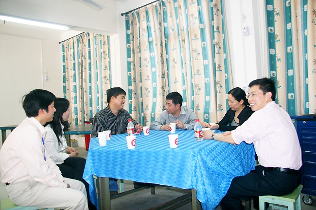 从汽车实训基地主车间出来后,考虑到参观时间已经很久,张书记建议安排休息一会儿,交通工程系同志在板金实训室用两张实训桌拼在一起,组成一个“会议桌”,院办公室同志倒上茶水,林处长、张处长、张书记、熊教授、柳遂文处长、刘学贵书记、张红英主任、曾鑫主任围在一起,林处长利用这一机会,开起了一个座谈会,大家对示范院校建设、校企合作、课程体系、师资队伍建设和实训基地建设等内容进行了深入广泛的交谈。张书记希望在示范院校建设中应该考虑欠发达地区学校的示范作用,他们在硬件上不能与发达地区相比,但他们好的作法更加具有示范性,因为发达地区的硬件条件,别人学不了;实训基地的建设也是这样,150万对发达地区的学校不算什么,最多只是锦上添花,而对于欠发达地区来说,可以说是雪中送炭,希望教育部加大对贫困地区的支持力度。院长助理熊发涯反映在课程体系构建中,教育部推行的基于工作过程的学习领域课程体系是件好事,但每个学校都要进行从专业调研、行动领域分析、典型工作任务归纳到学习领域开发整个过程,各学校做出的结果差异很大,同一专业在全国的课程设置体系几乎完全不同,有的学校因为理念方法不到位,也可能走样,希望教育部组织起来,形成全国可参考的课程标准,形成标准课部分+地方特色课部分的课程体系参考,另外,教高16号文件中指出要制定高职院校教师的任职资格标准,特别是双师型教师的标准,希望尽快出台。林处长表示可以理解,教育部也会逐步解决这些问题。林处长对实训基地的建设进行了解:一是汽车实训基地300万是多了,还是少了,要多少才合适;二是设备采购方面,是自主采购好,还是集中采购好,要不要出台参考配置。张主任、曾主任根据我院的实际情况回答了林处长的问题。林处长还对学生可持续发展问题、学生就业问题、办学水平评估问题、双证书问题与座谈者交换了意见,他强调,要正确处理好高职与中职的区别,高职不仅要培养学生的动手能力,还要注意培养学生的可持续发展能力。