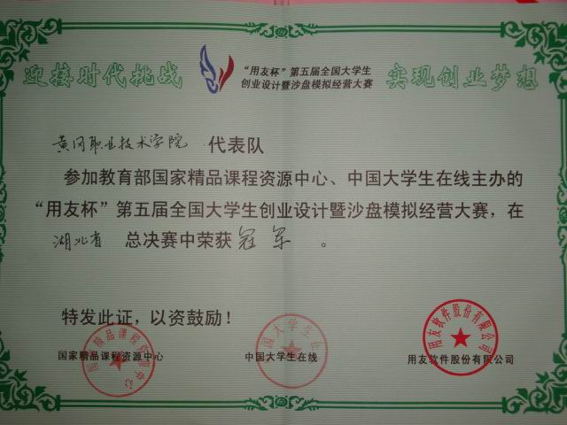 由教育部高等学校工商管理类专业教学指导委员会指导,国家精品课程资源中心与教育部中国大学生在线网站联合主办,用友软件股份有限公司承办的“用友杯”第五届全国大学生创业设计暨沙盘模拟经营大赛湖北省赛区的比赛于2009年6月28日落下帷幕,我院代表队再次荣获专科组冠军。