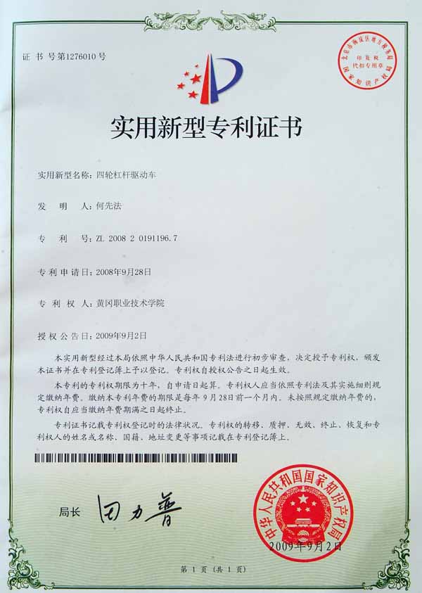 喜报:我院机电工程系又获一项实用新型专利 来源:机电工程系 作者:机电工程系 发布时间:2016-01-23 09:56:36 浏览次数: 次 【字体:小 大】 2009年9月2日,我院机电工程系何先法老师发明的四轮杠杆驱动车获得了国家实用新型专利证书。专利号为:ZL 2008 2 0191196.7。特向全院师生报喜。 分享到: 【打印正文】