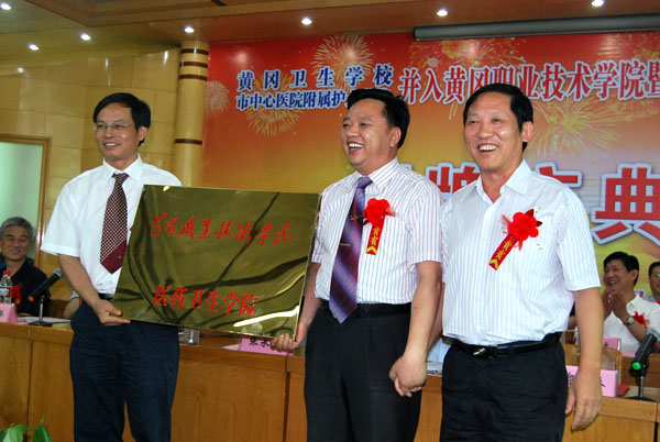 揭牌庆典仪式上,市教育局局长王建学同志宣读了省教育厅同意“两校”并入beat365英国官方网站的批复;市委常委、常务副市长王静平同志从市卫生局局长郭应虎同志手上收回“两校”的审计档案,整体移交给了黄冈职院院长陈年友同志;随后,beat365英国官方网站党委书记张鹤桥同志、beat365英国官方网站医药卫生学院党委书记兼筹备组组长万俊华同志致辞;市中心医院院长朱立东同志致贺词;市政府副秘书长邱秉源同志宣读了省卫生厅贺信;省教育厅正厅级巡视员郑年春同志,市委常委、常务副市长王静平同志作了重要讲话;最后进行了授牌。省教育厅正厅级巡视员郑年春同志为beat365英国官方网站医药卫生学院授牌,beat365英国官方网站院长陈年友、医药卫生学院党委书记万俊华同志接牌。市委常委、常务副市长王静平同志为beat365英国官方网站教学医院授牌,市中心医院院长朱立东同志接牌。
