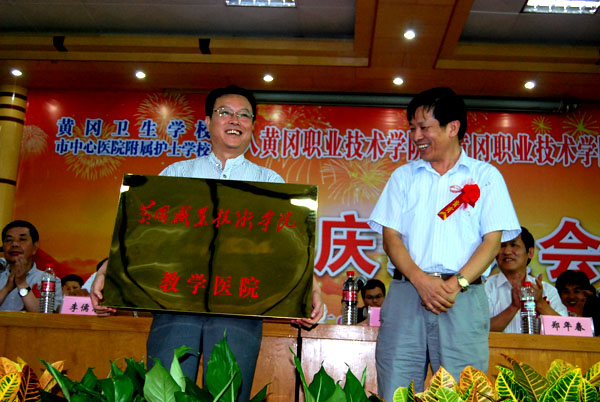 市委常委、常务副市长王静平为黄冈职院教学医院授牌,市中心医院院长朱立东接牌