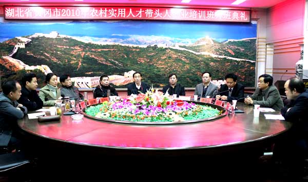 2010年12月13日上午9:00,湖北省黄冈市2010年农村实用人才带头人创业培训开班典礼在凝智楼四楼中心会议室隆重召开。参加开班典礼的领导有湖北省农业厅科教处正处级调研员高广金、省农业发展中心副主任陈钧,黄冈市委组织部副部长王基家、市农业局局长张烈松以及市人才办、财政局负责同志,学院党委书记张鹤桥、副院长段院生。生物工程系部分领导、老师和第一期培训班的全体学员参加了典礼。开班典礼由李建江主持。