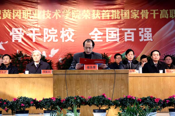 会上,市教育局局长王建学宣读了教育部、财政部文件。院党委书记张鹤桥致了热情洋溢的欢迎辞。院长陈年友详细介绍了国家骨干高职院校创建情况。麻城五中校长王黄州代表高中学校发言,他说,从毕业生的综合素质看出了黄冈职院成人成才教育理念的正确性;从学生的专业素养看出了黄冈职院的教学质量、师资队伍、团队建设是经得住社会实践检验的;从学院到五中办理学生入党调查函看出了黄冈职院党建工作和学生思想政治教育的先进性。正是由于这些无形资源和力量的支撑,麻城五中才与黄冈职院建立了长期的友好合作关系。