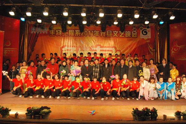 2010年的最后一个夜晚,大学生活动中心欢歌笑语,喜气洋洋,生物工程系2011年元旦文艺晚会隆重举行。院长陈年友教授、中国移动黄冈分公司校园营销中心刘经理、院党委组织部部长郑柏松、基础课部党总支书记兼学工处副处长熊楚舒、“一村一名大学生”协调办公室主任余寿君等领导老师与生物工程系800余名同学一同观看了演出。系党总支书记余亮彬在晚会开始前致新年贺词,他回顾了生物工程系在2010年取得的成绩,感谢各级领导对生物工程系的关心,期待2011年生物工程系在学院各级领导的关心和支持下,百尺竿头,更进一步。