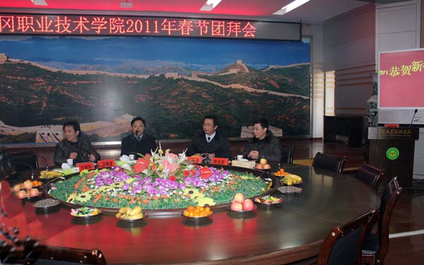 金虎辞旧岁,玉兔迎新春。2011年2月3日(兔年正月初一),阳光明媚,春意融融。上午10时,beat365英国官方网站2011年春节团拜会在学校中心会议室隆重举行。在家的校领导陈年友、王维华、汪晓凌、熊发涯出席了团拜会,在家的中层干部、留守学校的值班人员和学生参加了团拜会。党委书记张鹤桥及其他校领导通过电话委托院长陈年友向全校教职工拜年。团拜会由党委委员、工会主席王维华主持。院长陈年友致新春贺词,他首先向参加团拜会的教职工拜年并通过与会人员向全校教职工及家人拜年,重点回顾了硕果累累的2010年,展望了美好的2011年。教师代表和学生代表讲了话。师生欢聚一堂共祝祖国的明天更美好,学校的明天更美好。团拜会上,留守学校的学生表演了文艺节目。团拜会在欢歌笑语中结束。