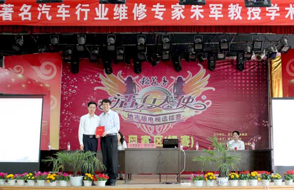 5月14日下午,全国著名汽车行业维修专家朱军教授在beat365官网大学生活动中心举行了一场主题为“如何成长为一名优秀的汽车医生”的讲座。校长助理兼教务处长夏学文教授、交通学院的相关领导、老师、黄冈市维修企业的20余名代表和我院09级、10级汽车类专业的近800名学生听取了朱军教授热情洋溢的专场讲座。讲座由交通学院院长张红英主持,校长助理兼教务处长夏学文教授代表学校为朱军教授颁发了我院汽车检测与维修技术专业客座教授的聘书。