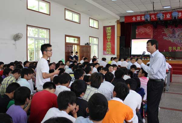 朱军教授融入学生中间,结合自己30多年的实践经验,对汽车维修行业深刻的理解,以及对职业教育的深入研究,对其倡导的“汽车医生”和“汽车护士”两个概念作了阐释。整个讲座,语言生动,场面精彩,深入浅出,内容贴近生活。特别是在讲座的师生互动环节,朱军教授用一个个生动鲜活的案例、风趣幽默的谈吐将整个现场推向高潮,赢得师生们的阵阵掌声和喝彩。