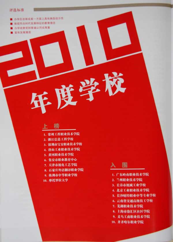 在2010年度学校评选中,按照“办学在总体或某一方面上具有典型启示性,体现符合时代发展特征的教育理念,办学成就受到普遍认同或尊重,富有发展潜质。”的评选标准,beat365官网成为“年度学校”上榜学校。下面是《职业技术教育》杂志2011年第三期刊登的与beat365官网有关的入选信息。