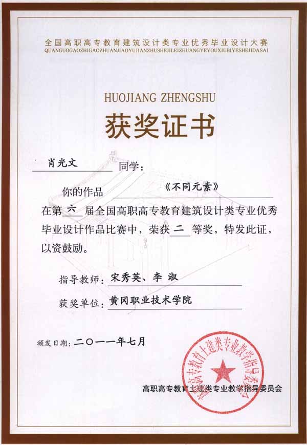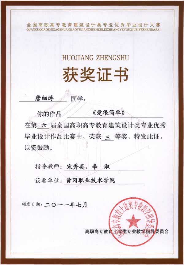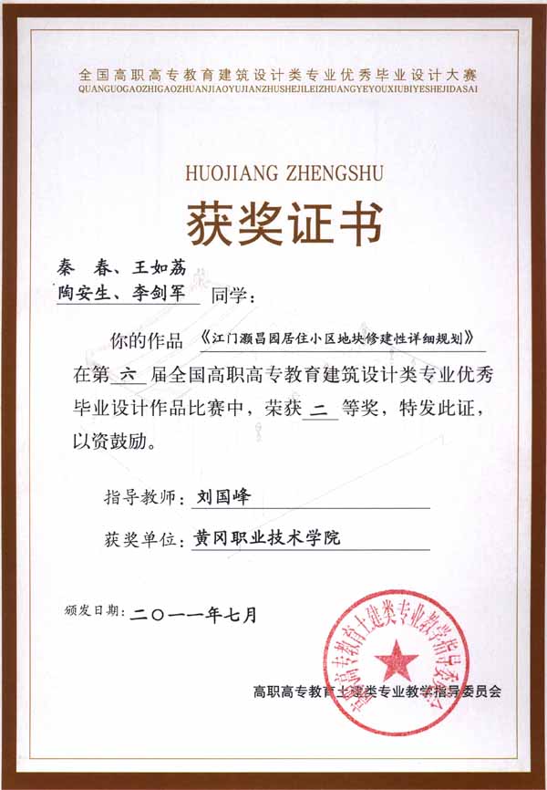 2011年7月23日至24日,高职高专教育建筑类专业教指委会议暨系主任论坛在江西南昌举行。会上,举办了第六届全国高职高专教育建筑设计类专业优秀毕业设计作品奖评选。beat365官网建筑学院08级秦春、王如荔、陶安生、李剑军同学的作品《江门灏昌园居住小区地块修建性详细规划》(该作品在环境艺术设计专业排名第二)和肖光文同学的作品《不同元素》分别获二等奖,詹细涛同学的作品《爱很简单》获三等奖,丁世洋同学的作品《浪漫满屋》、丁成武同学的作品《清新生活》和程晓燕同学的作品《宁静致远》获优秀奖。