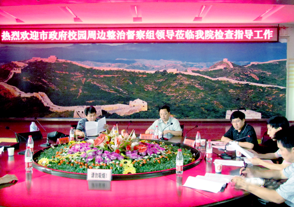 2011年8月11日上午,市政府办督查室主任徐志刚,市教育局副局长刘珍德、法制科科长徐利民等领导一行来beat365官网检查指导校园周边环境整治工作。督查组一行现场察看了beat365官网的校园周边环境现状后,在学校凝智楼四楼中心会议室听取了工作汇报。校长陈年友、党委委员郑柏松、办公室主任刘明涛、保卫处长邓国璋参加了汇报会。