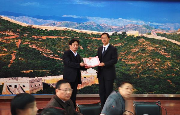 副校长汪晓凌给黄冈市旅游局党组书记田洪光颁发旅游类专业群校企合作理事会第一届理事会理事长证书