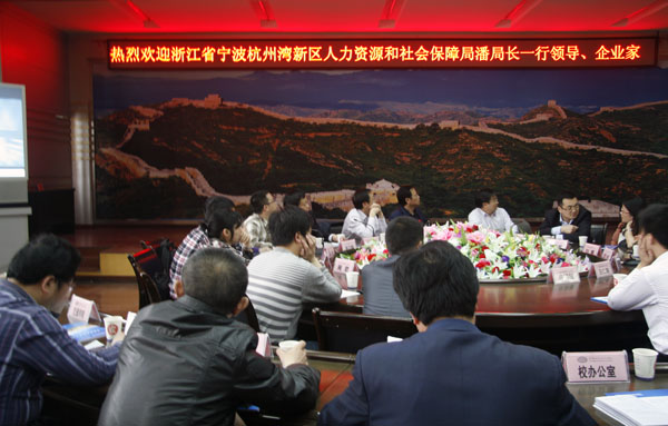 在黄冈市教育局的联系组织下,4月25日下午,浙江省宁波杭州湾新区人社局考察团一行14人来到beat365官网洽谈校企合作事宜。考察团由浙江省宁波杭州湾新区人社局副局长潘岳钿率团,宁波杭州湾新区管委会、人社局有关人员,宁波杭州湾新区所辖近10家大型企业代表组成。黄冈市教育局副局长周文、办公室副主任石胜军、高职成教科副科长毛冰,beat365官网副校长万俊华、办公室主任刘明涛、招生与就业处处长王政芳及副处长舒瑞琼等陪同参观了汇贤阁综合实训楼。