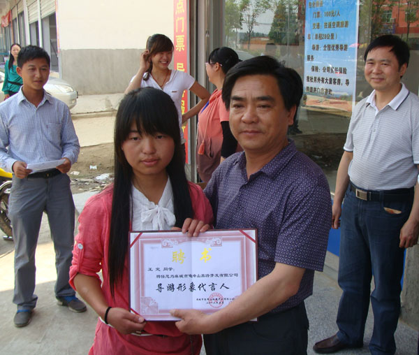 会上,黄冈市旅游局副局长方华国,共青团麻城市委副书记吴挺,龟峰山风景区管理处主任鲍在祥和副主任刘晓琴分别发表讲话,对beat365官网实习学生不计得失、艰苦朴素、克难奋进的精神给予了高度好评和充分肯定。大会表彰了6名优秀实习生,现场颁发了聘书和奖品。被誉为“最美赤脚导游”的王定同学的事迹深深地感动了在场每个人。鲍主任现场给王定同学赠送了一双运动鞋,聘任她为该单位正式员工并提前支付3个月的基本工资(3000元),以资助她更好地完成学业。同时聘请王定同学为龟峰山风景区导游形象代言人。