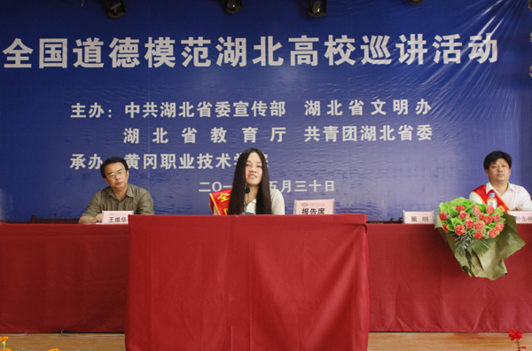 报告会由党委委员郑柏松主持。他在总结讲话中说:三位全国道德模范来到beat365英国官方网站,带来了他们的感人事迹,带来了他们的心路历程,更带来了他们的精神魅力和道德感召力。三位全国道德模范的真情讲述在平凡中见伟大,从中我们读出了对家、国、天下的担当,看到了真、善、美的中华美德,更感受到了社会主义核心价值的时代力量。全国道德模范代表走进革命老区大别山,为beat365英国官方网站两万余名师生带来了丰富的精神食粮。希望全体师生员工以全国道德模范为榜样,秉承革命老区的优良传统,爱岗敬业、乐于奉献、教书育人,希望各位同学认真学习他们的崇高精神,传播优秀道德文化,成长为信念执着、品德优良、知识丰富、本领过硬、开拓创新的高端技能型人才,为中华民族的伟大复兴而努力奋斗,用优异的成绩喜迎党的十八大胜利召开。