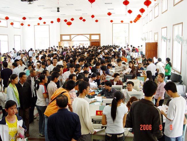 今天是我院本省新生报到的高峰,为了做好新生及学生家长的接待工作,我院组织专班搞好新生入校的一条龙服务。在武昌火车站和武昌付家坡汽车站等武汉、鄂州、黄州大型车站设有迎新接待站,组织新生及家长乘车来校,到校后各系、部及相关处室相互配合做好迎新工作,并由老生引导每一位新生办理入学报到手续,安排新生住宿。